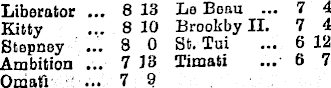 Liberator .. . 8 13 Le Bonu ... 7 4 Kitty . 8 10 Brookby II. 7 4 Stepney .. . 8 0 St. Tui 6 12 Ambition .. Omati . 7 13 . 7 9 Timati 6 7