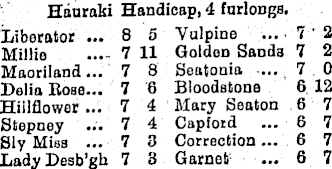 Hauraki Handicap, 4 furlongs. Liberator ... 8 5 Vulpine 7 2 Millie 7 11 Golden Sand3 7 2 Maoriland ... 7 8 Seutonia ... 7 0 Delia Ease... 7 6 Bloodstone 6 12 Hiilflower ... 7 4 Mary Seaton 6 7 Stepney 7 4 Capford 6 7 Sly Mios ... 7 3 Correction ... 6 7 Lady Desb’gh 7 3 Garnet 6 7
