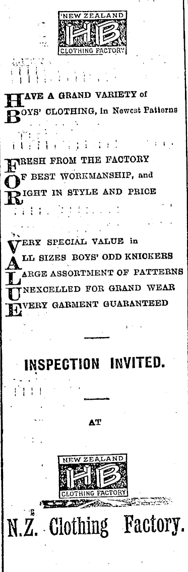 NEW ZEALAND £2 CLOTHING FACTOR I I jgj-AVE A GRAND VARIETY of P»OYS> CLOTHING, In Newest Patterns ! 1 "gJtfVESH FROM THE FACTORY BEST WORKMANSHIP, and -jpgIGHT IN STYLE AND PRICE SPECIAL VALUE in SIZES BOYS’ ODD KNICKERS ASSORTMENT OF PATTERNS FOR GRAND WEAR GARMENT GUARANTEED INSPECTION INVITED. AT H.Z, Clothing Factory.