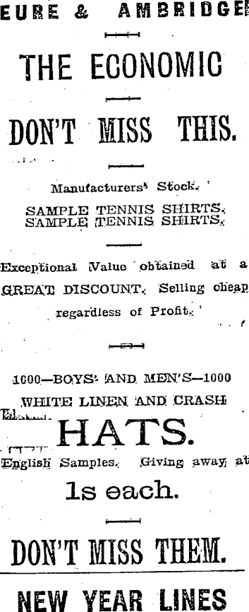 EUHE & Amß E\ D GEP THE ECONOMIC DON’T MISS THIS. Manufacturers 4 Stock.SAMPLE TENNIS SHIRTS, SAMPLE TENNIS SHIRTS,; Exceptional iValue obtained at a .GREAT DISCOUNT.: Selling cheap regardless of Profit,: IGOO—BOYS’- AND. MEN’S—IOOO WHITE LINEN AND CRASH TaL, HATS. Samples, Giving Is each. . Tr?T EnglisK Samples.; .Giving away] at DON’T MISS THEM. NEW YEAR LINES