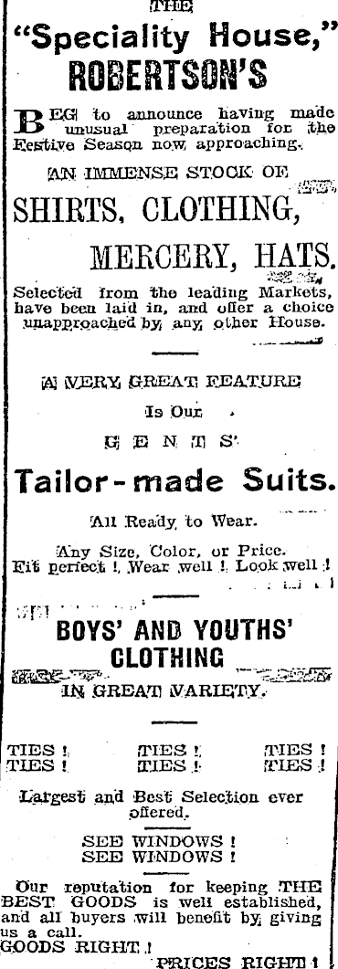 THE “Speciality House,” ROBERTSON’S BEG, to announce having made unusual preparation for the Eesrfchve Season now; approaching.; AN IMMENSE STOCK OF, SHIRTS, CLOTHING, MERCERY, HATS. 5. Selected from the leading Markets, have been laid in, and oiler a choice unapproachetl by, any; other House. SV3 MERY, GREAT FEATURE Is Our. KENT! S’ Tailor-made Suits. All Rea'dy, to Wear. •Any Size, Color, or Price. Fit perfect !, .Wear .well ! Look well ; ! ; i._j , I BOYS’ AND YOUTHS’ CLOTHING _ IN .GREAT IVARIETY, TIES !, .TIES *; TIES ! TIES ! TIES ,!• TIES .! •Largest and Best Selection ever pflered.. SEE WINDOWS ! SEE WINDOWS ! Our reputation for keeping THE BEST GOODS is well established, and all buyers will benefit by giving us a call. GOODS RIGHT ! PRICES RIGHT 1