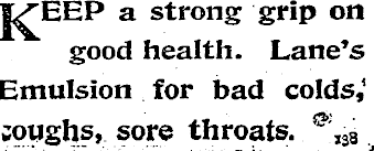k eep a strong grip on good health. Lane’s Emulsion for bad colds, 1 soughs, sore throats.