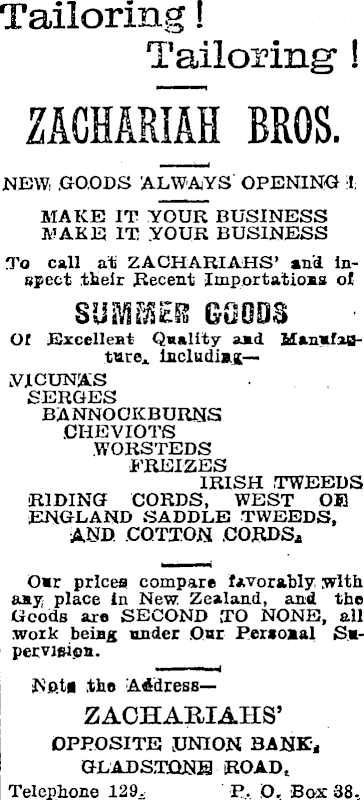 Tailoring! Tailoring ! ZACHARIAH BROS. NEW GOODS ALWAYS OPENING ■!. MAKE IT YOUR BUSINESS MAKE IT YOUR BUSINESS To call at ZACHARIAHS’ and inspect their Recent Importations of SUMMER GOODS Ot Excellent Quality and Manmfaßture x Including—.VlCUNAS SERGES BANNOCKBURNS .CHEVIOTS WORSTEDS FREIZES IRISH ,TWEEDS RIDING CORDS, WEST OB ENGLAND SADDLE TWEEDS, AND COTTON .CORDS* Our prices compare favorably, with any place In New Zealand, and the Goods axe SECOND TO NONE, all work being under Our Personal Supervision. Kota the Address— ZACHARIAHS’ OPPOSITE UNION BANK, GLADSTONE ROAD, Telephone 129, E, O. Bax 38.