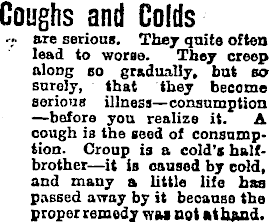 Coughs and Colds are serious. They quite often lead to worse. They creep aloDg so gradually, but ax surely, that they become serious illness—consumption —before you realize it. A cough is the seed of consumption. Croup is a cold’s halfbrother—it is caused by cold, and many a little life has passed away by it because the proper remedy was not at hand.