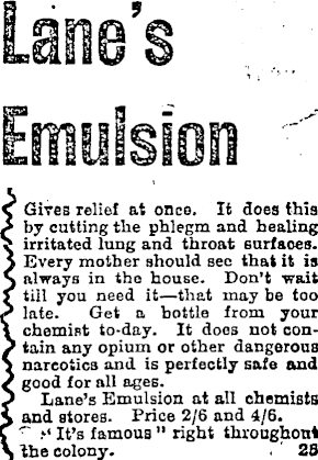 C Gives relief at once. It does this by cutting the phlegm and healing o irritated lung and throat surfaces. 3 Every mother should sec that it is S always in the house. Don’t wait f till you need it—that may be too ? late. Get a bottle from your \ chemist to-day. It does not con- / tain any opium or other dangerous S narcotics and is perfectly safe and / good for all ages. J Lane’s Emulsion at all chemists S and stores. Price 2/6 and 4/6. C r It’s famous ” right throughout \ the colony. 2S
