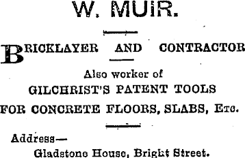 W, MUIR, -gBIGKLATER AND CONTRACTOR Also worker of GILCHRIST’S PATENT TOOLS FOR CONCRETE FLOORS, SLABS, Eio. Address— Gladstone House, Bright Street.