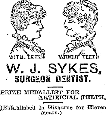 W. J. SYKES, SURQEOM OESTiST. PRIZE MEDALLIST FOR ARTIFICIAL TEETH. .(Established la Gisborne lor Eleven years.)