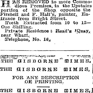 Mi&S REMOVED Ito more Commodious Premises, In the Upstairs portion ol the Shop, opposite the Firebell and F. Hall’s, painter. Entrance from Bright Street. iTeeth Extracted from 10 to 12 — One Shilling. Private Residence ; Read’s JQuay, near Wharf. Telephone, No. 16j .THE GI SBOR NE " IE IME Sj THE GISBORNE [DIMES. FOR ANY DESCRIPTION OE PRINTING. THE GISBORNE TIMES*/