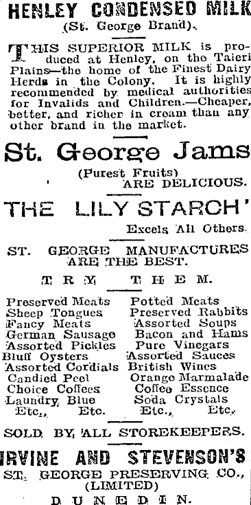 HEALEY ®MLK (St. George Brand).. THIS SUPERIOR MILK is produced at Henley, on tho Taicri Plains—the home of the Finest Dairy 1-lerdn in the Colony. It is highly recommended hy medical authorities for Invalids and Children. —Cheaper, better, and richer in cream than any other brand in the market. St. Jams (Purest Fruits') ARE DELICIOUS. THE LILY STARCH’ Excels All OthorsST. GEORGE MANUFACTURES ARE .THE BEST. T R Y T II E M. Preserved Meats Potted Meats Sheep Tongues Preserved Rabbits Fancy Meats Assorted Soups German Sausage Bacon and Hams Assorted Pickles Pure Vinegars Blull Oysters Assorted Sauces Assorted Cordials British Wines Candied Peel Orange Marmalade Choice Coffees Coffee Essence Laundry Blue Soda Crystals Etc., Etc. Etc., Etc,: SOLD BY, ALL STOREKEEPERS. mim Aio steveksosts ST. GEORGE PRESERVING. CO., (LIMITED) DUNEDIN-