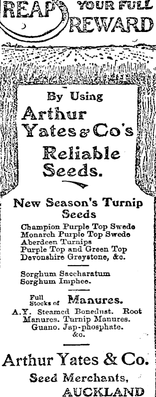 KEAF TOUR FULL :WARD; "him By Using Arthur Yates g? Cos H| II Reliable ffs I'.M Seeds. HI New Season’s Turnip Seeds Champion Purple Top Svrede Monarch Purplo Top Swede Aberdeen Turnips Purple Top and Green Top Devonshire Greystone, &o. Sorghum Saccharatum Sorghum Imphee. Manures. Full Stocks of A.Y. Steamed Bonednsfc. Boot Manures. Turnip Manures. Guano. Jap-phosphate. &o. Arthur Yates & Co. Seed Merchants, AUCKLAND