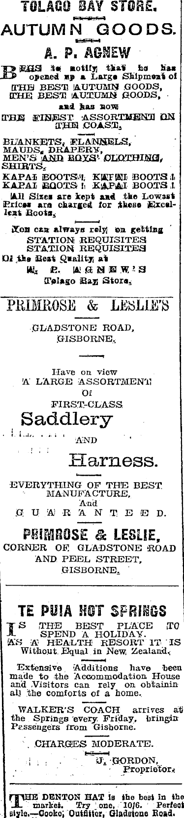 TOLAG9 BAY STORE, AUTUM N GOO DS. A. P. AGBIEW BiSS itaf notify; that' ha has opened up a Largo Ship moat oi THE BEST! AUTUMN GOODS, [THE BEST AUTUMN GOODS, and has now THE EINEST- ASSORTMENT ON THE .COAST, BLANKETS, FLANNELS, MAUDS, DRAPERY, MEN’S AND BQXS’- GLOTBINfI, SHIRTS,KAPAI BOOTS.'!, KKFffil BOOTS 1 KAEAI BOOTS !, KAPAI BOOTS I i AH Sizes are kept and the Lowest Brices ara charged lor these Excellent Boots, Xoa can always rely; on getting STATION REQUISITES STATION REQUISITES D 1 the Beat Quality; at A!- E. KSSB W a Tolago Bay; Store, PRIMROSE & LESLIE'S GLADSTONE ROAD, GISBORNE, I-lave on view A LARGE ASSORTMENT Of FIRST-CLASS Saddlery AND Harness. EVERYTHING OF THE BEST MANUFACTURE, And GUARAN T E E D. PBTOOSE & LESLIE, CORNER OF GLADSTONE ‘ROAD AND PEEL STREET, GISBORNE, TE PUJA KOI SPRINGS IS THE BEST PLACE TO SPEND A HOLIDAY. AS A' HEALTH RESORT IT IS Without Equal in New, Zealand, Extensive Additions have been made to the Accommodation House and .Visitors can rely on obtainin all the comforts of a home, WALKER'S COACH arrives at the Springs every Friday, bringin Passengers from Gisborne. . CHARGES MODERATE. • : iJ, GORDON, Proprietor.: npHE DENTON HAT Is the best in the JL market. Try one, 10/6. Perfeot style.—Cooko, Outfitter, Gladstone Hoad.