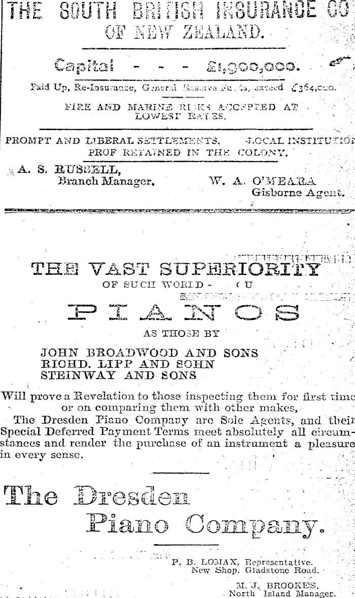 •; f tr~ fit. SOUTH BRITISH INSURANCE CO OF NEW ZEALAND. Capital £i.g©©,©OG. Paid Up, Re-lasuraace, G;ner:;l Ruseiva v'u . is, exceed 4364,0^0. VIRE AC® MARINE RI KS -ACCEPTED AT LOWEST EEt iS. PROMPT AND LIBERAL SETTLEMENTS. -LOCAL INSTITUTION PROF RETAINED IN THE COLONY. A. S. BUSSELL, Brandi Manager, W. A. O’MEABA Gisborne Agent. THE! VAST BUPEIBIOBIXY * 1 ? "• OF SUCH WORLD C U PI A ZEST O S AS THOSE BY JOHN 33 BO AID WOOD AND SONS RIOHD. LIPP AND SOHN STEIN WAY AND SONS Will prove a Bevelation to those inspecting them, for first time or on comparing them with other makes, The Dresden Piano Company arc Sole Agents, and their Special Deferred Payment Terms meet absolutely all circumstances and render the purchase of an instrument a pleasure in every sense. T3ie Dresden Piano Company. P. S. LOMAX, Representative. New Shop, Gladstone Road. jtf. J, BROOKES, ' . . . North Island Manager.