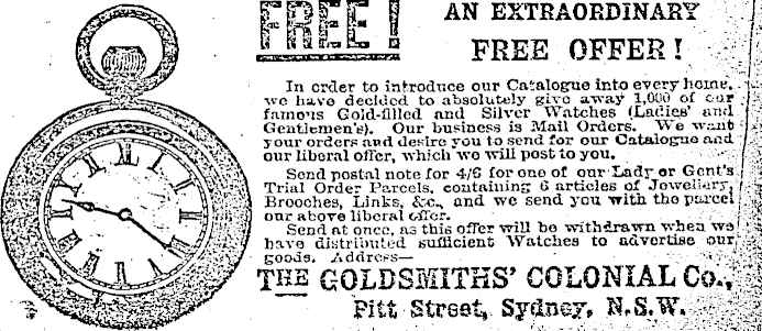 AN EXTRAORDINARY J FREE OFFER I In order to introduce our Catalogue into every home, we have decided to absolutely give away 1,000 of car famous Gold-filled and Silver Watches (Ladies’ and Gentlemen's). Our business is Mail Orders. We want your orders and desire you to send for our Catalogue and our liberal oficr, which wo will post to you. Send postal note for 4/S for ono of our Lady or Gent’s Trial Order Parcels, containing t> articles of Jewellery. Brooches, Links, and we send you with the parcel our above liberal offer. „ , Send at orre. as this offer will bo withdrawn when we have distributed sufficient Watches to advertise our goods. Address— '• ATHE GOLDSMITHS' COLONIAL Co., Flit Street, Sydney, N.S.W.