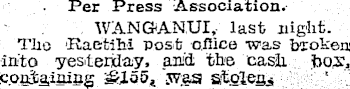 Per Press Association. WANGANUI, last night. The ‘Raetibi post office was broken; into yesterday, and the cash box, containing iSloo, jyaa steles*