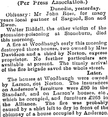 (Per Press Association.) Dunedin, yesterday. Obituary: Mr John Ross, for many years local partner of Sargood, Son and Ewen. . . , . Walter Riddell, the other victim of the ptomaine-poisoning at Stoneburn, died this morning. , , . A firo at Wooclhaogh eorly this moaning destroyed three bouses, two owned by Miss Davidson und a third by Norton, express proprietor. No further particulars are available at present. Tho timely arrival of the fire brigade saved the whole street. Later. The houses at Woodhaugh were owned by Larson, hot Norton. The insurances on Anderson’s furniture were £BO in the Standard, and on Larson’s houses, etc , which he occupied, and furniture £265 in the Alliance. Tho fire was probably oaused by a shirt left to dry in front of the chimney of a house occupied by Anderson.