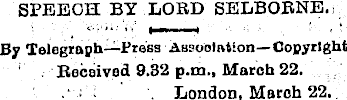 SPEECH BY LORD SELBORNE. By Telegraph—Press Association—Copyright Received 9.32 p.m,, March 22. London, Maroh 22.