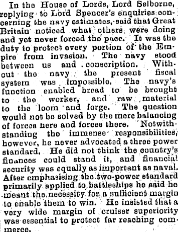 In the House of Lords, Lord Selborne, replying to Lord Spencer’s enquiries oon-. oerning the navy estimates, said that Great Britain noticed what others were doing and yet never forced the pace. It was the duty to protect every portion of' the Empiro from invasion. The navy stood between us and , conscription. Without the navy tho present fiscal system was . impossible. The navy’s function enabled bread to bo brought to the worker, and raw material to the loom and forge. The question would not bo solved by the mere balancing of forces nore and forces there. Notwithstanding the immense- responsibilities, however, be never advocated a three power standard. He did not think the country’s finances could stand it, and financial security was equally as important as naval. After emphasising the two-power standard I primarily applied to, battleships he said be [.meant the,necessity." for. a sufficient margin Ito enable them to win. He insisted that a I very wide margin of cruiser superiority 1 was essential to protect far reaching commerce.