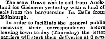 Tho aoow Bravo was to sail from Auckland for Giaborno yesterday with a load of salt from the barguontino La Bello from Edinburgh. In order to facilitate tho gonoral public receiving their correspondence before leaving town to-day (Thursday) tho lottor carriers will start their deliveries at 8 a.m.