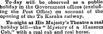 To-day will bo. obsorved as a public holiduy in the Government oilices (excluding tbo Post Office) on account of tho opening of tho To Karalia railway. To-night at His Majesty’s Theatre a real holiday bill—the “ Mystery of a Hansom Cab," with a real cab and real horse.