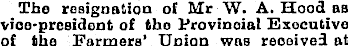 The resignation of Mr W. A. Hood as vice-president of tho Provincial Executive of tho Farmers’ Union was received at