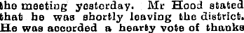 tho meeting yesterday. Mr Hood stated that bo was shortly leaving the district. He was accorded a hearty vote of thanks