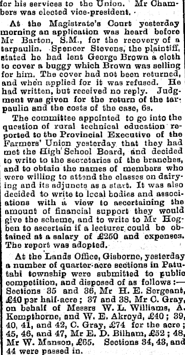 for his services to the Union bors was elected vice-president, At the Magistrate’s Court yoslordoy morning an application was hoard before Mr Barton, S.M., for the recovery of o tarpaulin. Spencer Stevens, tho plaintiff, stated he had lent George Brown a cloth to cover a buggy which Brown was selling for him. The cover had not been returned, and whe'n applied for it was refused. He had written, but received no reply. Judgment was given for the return of the tarpaulin and the costs of the case, 6s. The committee appointed to go into the question of rural technical education reported to the Provincial Executive of the Farmers' Union yesterday that they had met the High' School Board, and decided to writo to tho secretaries of the branches, and to obtain the names of members who were willing to attend the classes on dairying and its adjuncts as a start. It was also decided to write to local bodies and associations with a view to ascertaining the amount of financial support they would give the scheme, and to write to Mr Hogben to ascertain if a lecturer could be obtained at a salary of £250 and expenses. The report was adopted. At the Lands Office, Gisborne, yesterday a number of quarter,acre sections in Fatutabi township were submitted to publio competition, and disposed of as follows : Seotions 35 and 36, Mr H. E. Sergeant, £4O par half-acre ; 37 and 38, Mr C. Gray, on behalf of Messrs W. L. Williams, A. Kempthorne, and W. E. Akroyd, £4O ; 39, 40, 41, and 42, O. Gray, £74 for the aore ; 45, 46, and 47, Mr E. D. Bilham, £52 ; 48, Mr W. Manaon, £65. Seotions 34, 43, and 44 were passed in.