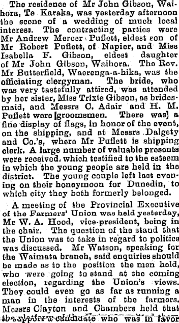 The residence of Mr John Gibson, Waihora, To Karaka, was yesterday afternoon the scene of a wedding of mnoh local interest. The contracting parties were Mr Andrew Mercer Puflett, eldest eon of Mr Eobert Puflett, of Napier, and Miss Isabella P. Gibson, eldest daughter of Mr John Gibson, Waihora. The Kev. Mr Butterfield, Waerenga-a-hika, was the officiating clergyman. The bride, who was very tastefully attired, was attended by her sister, Miss Trixie Gibßon, as bridesmaid, and Messrs O. Adair and H. M. Puflett were [groomsmen. There was] a fine display of flags, in honor of the event, on the shipping, and at Messrs Dalgety and Co.’s, where Mr Puflett is shipping olerk. A large number of valuable presents were received, which testified to the esteem in which the young people are held in the district. The young couple left last evening on their honeymoon for Dunedin, to which oity thoy both formerly belonged. A meeting of the Provincial Executive of the Farmera' Union was held yesterday, Mr W. A. Hood, vice-president, being in the ohair. The question of the Btand that the Union was to taka in regard to politics wa3 discussed, Mr Watson, speaking for the Waimata branoh, said enquiries should be made as to the position the men hold, who were going to stand at the coming eleotion, regarding the Union’s views. They could even go as far as running a man in the interests of the farmers. Messrs Clayton and Chambers held that ate who was'in favor
