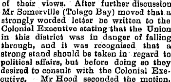 of their viewß. After further discussion Mr Somerville (Tolago Bay) moved that a strongly worded letter be written to the Colonial Executive stating that the Union in this district was in danger of falling through, and it was recognised that a strong stand should be taken in regard to political affairs, but before doing so they desired to consult with the Colonial Executive. Mr Hood seconded the motion,