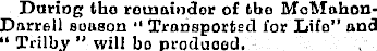 During tho romaindor of tho MoMahonDarrell season “ Transported for Life” and “ Trilby " will bo produced.