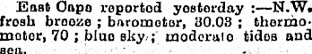 East Oapo reported yesterday :—N.W« frosh breeze ; barometer, 80.03 ; thermomotor, 70 ; blue sky ; modoralo tidoe and aoa.