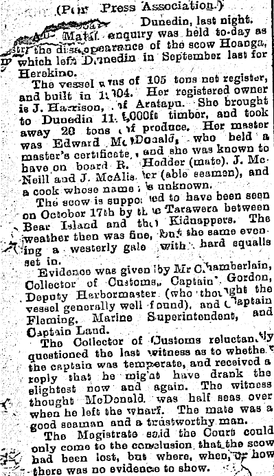 (PuiT Press Association^ Dunedin, last night. enquiry was held to-day as E«iars,nce of the scow Hoanga, left IDiWedxn in beptembei last for He The vessel utas of 105 tons net register in i<lo4. Her registered owner f 9 J Ha-risonaf Aratapu." She brought to Dunedin 11 t,ooofc timber, and took Iwa? 20 tonV P-dnce. Her master wa g Edward Me »£° aal<J « wbo , beld “ master’s certificate.. she was known to have on board B. Hodder (mate). J. Me -Kelli and J. MeAlis. \cr (able seamen), and a cook whose name ; » unknown. The scow is suppoi >ed to have b ° e ° on October 17tb by tL te Tarawera between , Bear Island arid thO Kidnappers. The ' .weather then was fine, bn* .he.same evom Jl'iiDg a westerly gale With hard equalls was given !by Mr Chamberlain, Collector of Customs,, Captain « DeDOtv Harbormaster (who ■ thoOgn* ■ *““ ' vessel generally well found), and t Fleming, Marine Superintendent, auu Captain Land. The Collector of Customs reluctam ‘y questioned the last witness as to whethe* the captain whb temperate, and received a reply that ho might have drank the aliobtest now and again. The witness V thought McDonald, was half seas over v- when he left the wharf. The mate was a eood seaman and a trustworthy man. “ The Magistrate said the Court could - only come to the ccrvalusion that_the seow had been lost, but where, wheD,TJ)t how there was no evidence to show. •-