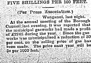 FIVE SHILLINGS PER 100 FEET. (Per Press Association.) ■ Wanganui, last night. j At the annual meeting of the Borough j .Council ;last evening, it was reported that the municipal gasworks had made a profit of £2745 during the year. Since the gasworks has municipalised a reduction of 30 per cent, on the selling price of "gas has ' been made. f The price naxt .year will be 5a per 1000 feet..-' ' ■ “" ■ ./ . ' ■ ,