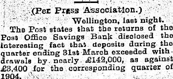 (Pet Press Association.) . Wellington, last night. The Post states that the returns of the Post Office Savings Bank disclosed the interesting fact that deposits daring (be quarter ending 31st March exceeded withdrawals by nearly 11142,000, as against £3,400 for the corresponding quarter of 1904.