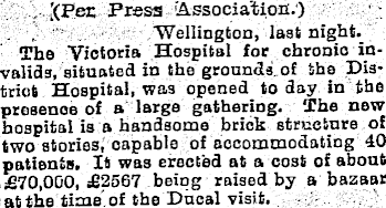 [(Pec Press Association.) Wellington, last night. The Victoria Hospital for chronic invalids, situated in the grounds of the District Hospital, was opened today in the presence of a large gathering. The new hospital is a handsome brick structure of two stories, capable of accommodating 40 patients. It was erected at a cost of about £70,000, £2567 being raised by a bazaar at the time of tho Ducal visit.