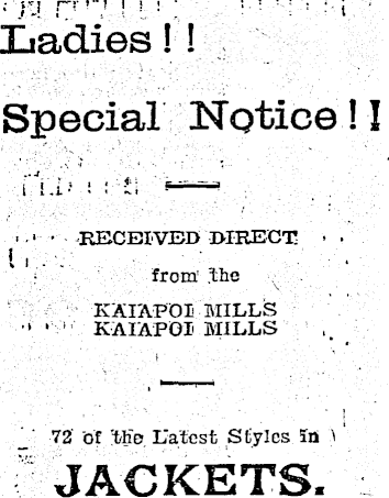 Ladies! ! Special Notice! I n.i.' 1 1 ■ ■ • RECEIVED DIRECT l. . . from' the KAIAPOI MILLS ' KAIAPOI MILLS 72 of the Latest Styles ’in ' JACKETS.