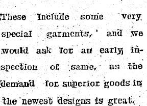 .These Include some very, special garments,- ' and we would ash lor an early inspection o£ same, as the demand lor superior goods in the newest designs is great.