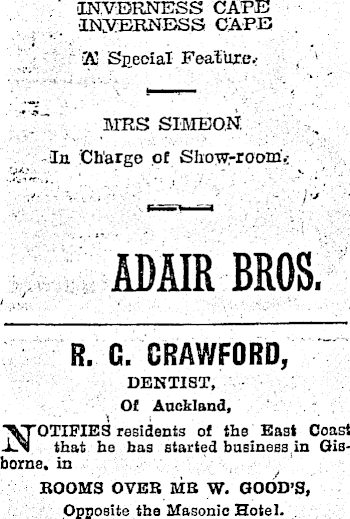■INVERNESS CAPE INVERNESS CAPE M Sp,eoial Feature.MRS SIMEON In Charge of Show-room.: ADAIR BROS. R. G. CRAWFORD, DENTIST, Of Auckland, -\rOTIPIES residents of the East Coast -131 that he has started business in Gisborne, in ROOMS OVER MR W. GOOD’S, Opposite the Masonic Hotel.