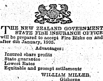 THE NEW ZEALAND GOVERNMENT STATE EIRE INSURANCE OKFICB will be prepared to aocept Fire Rißka on And after 4th January, 1905. Advantages: Insured share profits State guarantee Lowest Bates Equitable and prompt settlements WILLIAM MILLER, Gisborne