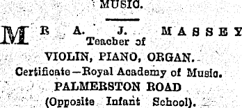 MUSICS. MB A. J. MASSEY Teacher of VIOLIN, PIANO, ORGAN. Certificate —Boyal Academy of Musio. PALMERSTON ROAD (Opposite Infant School).