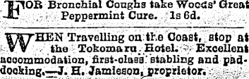 F OB Bronchial Coughs take Woods* Great Peppermint Care. Is 6d. then Travelling on the Coast, stop at the Tokomaru.. Hotel. Excellent accommodation, firat-olasa stabling and paddocking.—J. H. Jamieson, proprietor. i