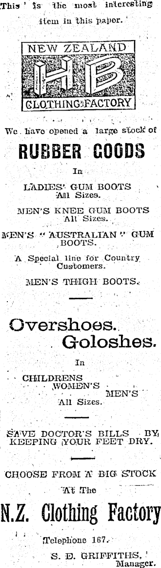 This ’ is : tlic most interesting item in this paper. NEW ZEAL-AMP RLO.T.HINGSPACTORY We have opened a largo stocK of RUBBER GOODS In LADIES’ GUM BOOTS AM Sizes. MEN’S KNEE GUM BOOTS All Sizes. MEN’S “ AUSTRALIAN GUM BOOTS. A Special line for Country Customers. MEN’S THIGH BOOTS, Overshoes. Goloshes. In CHILDRENS .WOMEN'S MEN’S All Sizes. SAVE DOCTOR’S BILLS BY, KEEPING (YOUR FEET DRY. CHOOSE FROM A’ BIG STOCK •At The N.Z. Clothing Factory, Telephone 167, S. E. GRIFFITHS, ! Manager.