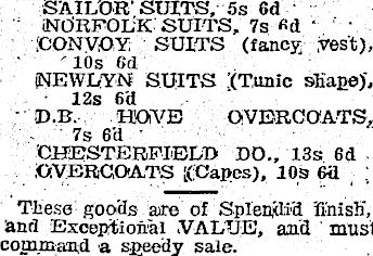 SAILOR 1 SUITS, 5 s 6d -NORFOLK SUITS, 7s fid [CONVOY SUITS (fancy. .Vest), 'los 6d NEWLY-N SUITS (Tunic shape), • 12s 6'd D.B. HOVE OVERCOATS, 7s 6'd CHESTERFIELD DO., 13s 6d OVERCOATS (Capes), 10s 6d These goods are of Splenjcli'd linisK, and Exceptional VALUE, and must command a speedy sale.