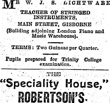 j|/pt W. J. S. LICHTWABK TEACHER OF STRINGED INSTRUMENTS, MAIN STREET, GISBORNE (Building adjoining London Piano and Masio Warehouse). TERMS: Two Guineas per Quarter. Pupils prepared for Trinity College examination. .THE . “Speciality House,” ROBERTSON'S.