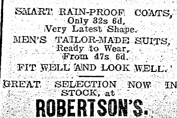 SMART RA'IN-PR'O OF, COAjTS,. Only 32s Gd, Very Latest Shape. MEN’S TAILOR-MADE SUITS, Ready to Wear,. ’ ■From 47s 6d. FIT WELL AND LOOK WELL', 1 :great. SELECTION NOW IN STOCK, at ROBERTSONS.