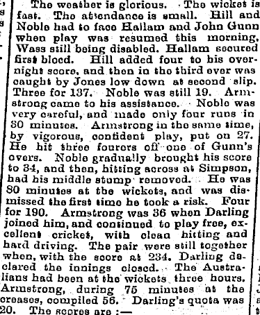 The weather ia glorious. The wicket is fast. The attendance is small. Hill and Noble had to faoo Hallam and John Gunn when play was resumed this morning, Wass still being disabled. Hallam seourod first blood. Hill added four to his overnight score, and then in the third ever was caught by Jones low down at seoond Blip. Throe for 137. Noble was still 19. Arm- , strong oame to his assistance. Noble was very oarefui, and made only four runs in 30 minutes. Armstrong in the same time, by vigorous, confident play, put on 27. He hit three fourers off one of Gunn’is overs. Noble gradually brought his score to 34, and then, hitting across at Simpson, had his middle stump removed. He was 80 minutes at the wickets, and was dismissed the first lime he took a risk. Four for 190. Armstrong was 36 when Darling joined him, and continued to play free, esoellent cricket, with clean hitting and hard driving. The pair were still together when, with the soore at 234. Darling declared the innings closed. The Australians had been at the wiokets throe hours. Armstrong, during 75 minutes at the creases, compiled 56. Darling's quota was 20. The Rcores are :