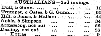 I AUSTRALIANS—2nd innings. [ Duff, b Gunn ... ... ... ... 10 Trumper, o Oates, b G. Gunn 61 Hill, c Jones, b Haliam ... ... 44 Noble, b Simpson 34 ArmstsoDg, not out ... ... ... 56 Darling, not out ... ... ... 20 Extras ... ... ... ... 9