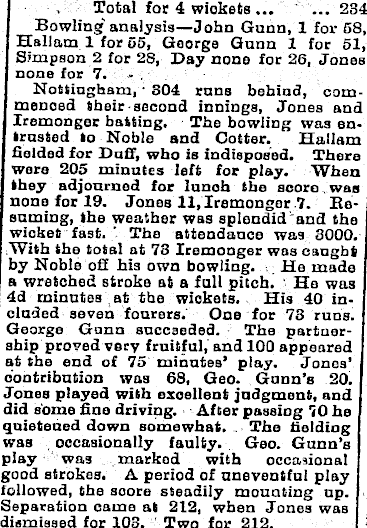 Total for 4 wickets ... ... 234 Bowling analysis—John Gunn, 1 for- 58, Hallam 1 for 05, George Gunn 1 for 51, Simpson 2 for 28, Day none for 26, Jones none for 7. Nottingham, • 304 runs behind, commenced their second innings, Jones and Xremonger baiting. The bowling was entrusted to Noble and Cotter. Hallam fielded for Duff, who is indisposed. There were 205 minutes left for play. When they adjourned for lunah the ecoro was none for 19. Jones 11, Iremonger 7. Besoming, the weather was splendid and the wioket fast. The attendance was 3000. With the total at 73 Iremonger was caught by Noble off his own bowling. He made a wretched stroke at a full pitch. He was | 4d minutes at the wickets. His 40 included seven fourers. One for 73 ruos. George Gann succeeded. The partaer- [ ship proved very fruitful, and 100 appeared at the end of 75 minutes’ play. Jones’ contribution was 68, Geo. Gunn’s 20. Jones played with excellent judgment, and did tome fine driving. After passing 70 he quieteued down somewhat. The fielding was occasionally faulty. Geo. Gunn’s play was marked with occasional good strokes. A period of uneventful play followed, the score steadily mounting up. Separation came at 212, when Jones was dismissed for 103. Two for 212,