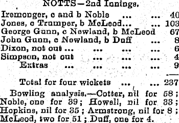 NOTTS—2nd Innings. Iremonger, c and b Noble 40 Jones, c Trumper, b McLeod 103 George Gunn, c Newland, b McLeod 67 John Gunn, c Newland, b Duff ... 8 Dixon, not out 6 Simpson, not out 4 Extras 9 Total for four wickets ... ... 237 Bowling analysis.—Cotter, nil for 58 ; Noble, one for 39; Howell, nil for 83 ; Hopkins, nil for 35 ; Armstrong, nil for 8 ; McLeod, two for 51; Duff, one for 4.