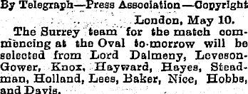 By Telegraph—Press Aaßooiation—Copyright London, May 10. The Surrey team for the match commencing at the Oval to-morrow will be selected from Lord Dalmeny, LevesonGower, Knox, Hayward, Hayes, Steadman, Holland, Lees, Baker, Nice, Hobbs, and Davis,