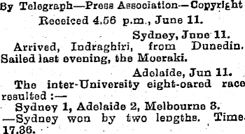 By Telegraph—Press Association—Copyright Received 4.56 p.m., June 11. Sydney, June 11. Arrived, Indraghiri, from Dunedin. Sailed last evening, the Moeraki. Adelaide, Jun 11. The inter-University eight-oared race resulted : Sydney 1, Adelaide 2, Melbourne 3. —Sydney won by two lengths. Time, 17.36.